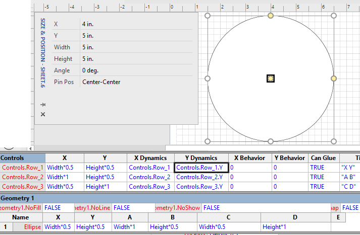 So how to explore the values? The easiest way is just to use Visio. Create a circle and open its’ shapesheet and play with it. The real fun Visio way is to add a Controls section and use the control handles to play with the Ellipse. So add a Control section to the shapesheet with three rows.