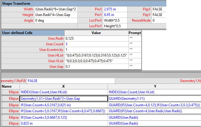 Initially I wanted to do this as a shapesheet segment, so I worked out the minimum requirement to create an ellipse, an Ellipse Geometry row with a User cell defining the radius and the X,Y cells defining the position. The other cells of the ellipse would be based on the X,Y cells and radius.