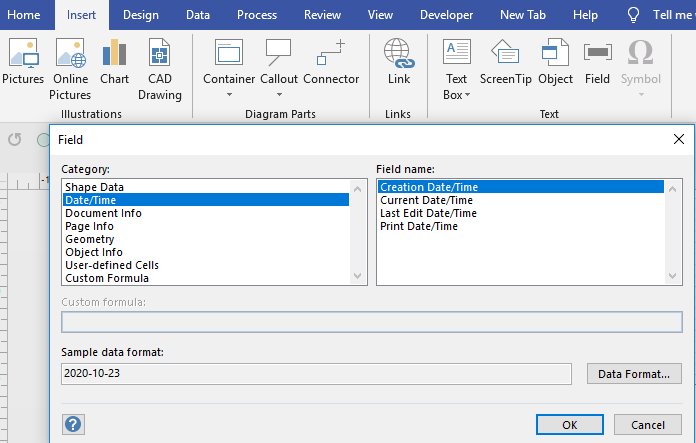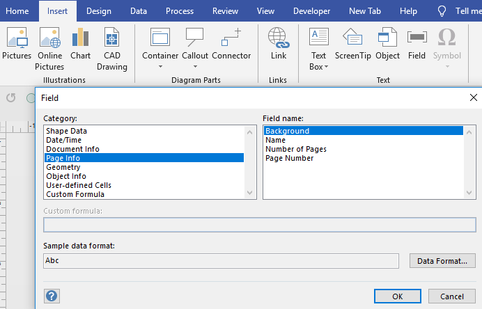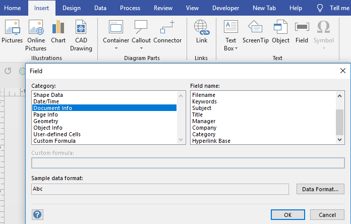 These are some of the choices when you insert a field. It could relate to the size of the shape, shape data or page and document information. So, if you need a title block with name, date and other information, you create one shape and just drop it on the page. Title blocks are usually dropped on background page and the shape will reflect information about the foreground page, the background page is attached to,