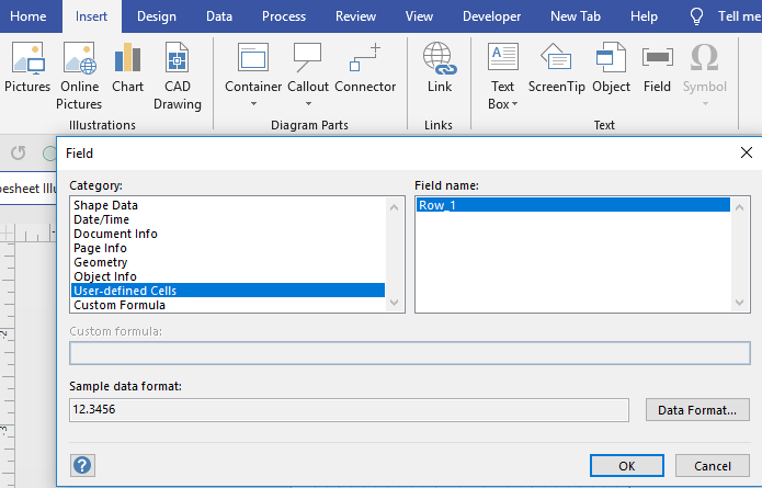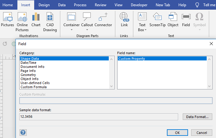 So, how do you add fields with VBA? This code will add the word “width”, the actual width of the shape and the page name to the text in the shape.