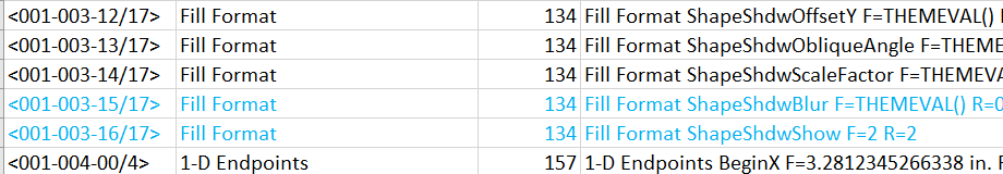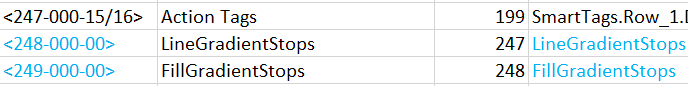 Of course, the Visio shapemiesters have to have their fun. Section 248, LineGradientStops is RowType 247, while Section 249 FillGradientStops is RowType 248 and Section 247 is RowType 199. Was that a mistake or are the shapemiesters just messing with us?