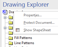 To show the document shapesheet, right click the first entry in the Drawing Explorer.