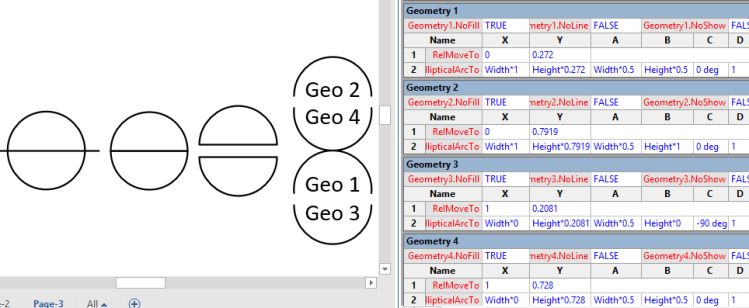To make it easier, I will start with the semicircle going up and do some cleanup, I can look at the other one later. The Geometry section will have two rows, a RelMoveTo and an EllipticalArcTo. I like to go left to right, so the first thing to do is swap the X,Ys of the two rows. Remember one is Rel… the other is not, so you will have to add Hieght or Width to one of the formula and remove them from the other. Actually, the only difference between the semicircle going left to right and the one going right to left is the X,Ys. the values of A,B,C & D are unchanged. For a semicircle, C is 0 and D is 0, so it is only a matter of determining A and B.