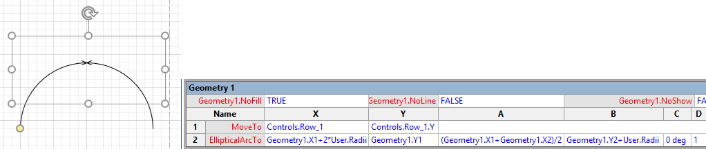 So, now you have an EllipticalArcTo Row based on the X,Y position and no reference to the Hieght or Width of the shape.