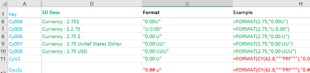 The row names indicate the Format group, Format Code and a unique identifier, some of the other columns are. The rows below are from the currency Formats from Create Shape Data.