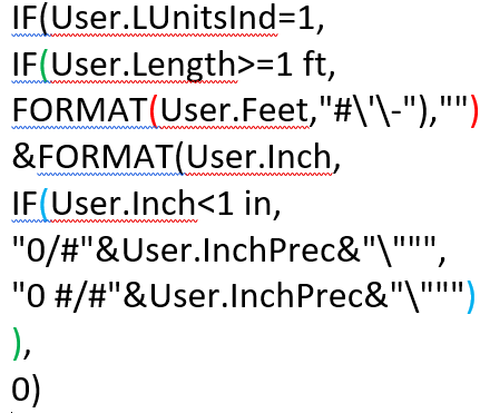 | User.FeetInch | IF(User.LUnitsInd=1,IF(User.Length>=1 ft,FORMAT(User.Feet,”#\’\-“),””)&FORMAT(User.Inch,IF(User.Inch<1 in,”0/#”&User.InchPrec&”\”””,”0 #/#”&User.InchPrec&”\”””)),0) |