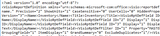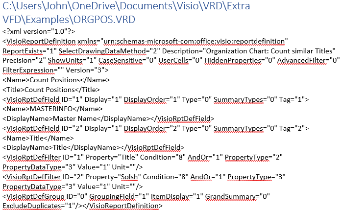 When you create a Visio report, you can choose to use an existing report or create one from scratch. In their wisdom, the original Visio team used XML to create/document the reports and gave the users the ability to create their own reports and save the report definition in an XML file with the extension of VRD. Being XML, these reports are readable, not pretty, but readable. I only came across one badly written blog on VRD files (that apply to Visio) and that was by me. So, I definitely need to create a document on the VRD file format and bring the blog up to date with correct information and David’s standards for a Visio blog. (If you are going to write about Visio, we want pictures.)