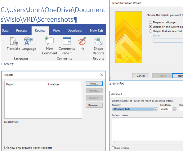 Visio has had reporting capabilities for several versions, but it has not been well documented. There are blogs and videos on how to create a report, so I decided to create a document to provide more details about the file that reporting feature creates *.VRD files. To do that I had to create two Word macros to help explore the topic. Luckily the original Visio team that created the Reporting feature left some bread crumbs for me to follow.