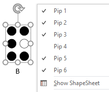Before posting my Braille shape, I decided to embellish it first. The original shape was a single shape that had a Geometry section (Ellipse) for each of the dots (pips) and user cells User.Dot1-Dot6 contained the list of characters the shape represented. The Ellipses are independent of the shape and positioned by the X,Y of the Geometry section,. The NoFill cell in each ellipse Geometry controlled the visibility of each pip. Of course, this required negative logic, so I had to work out how to make the pip visible and then negate it.