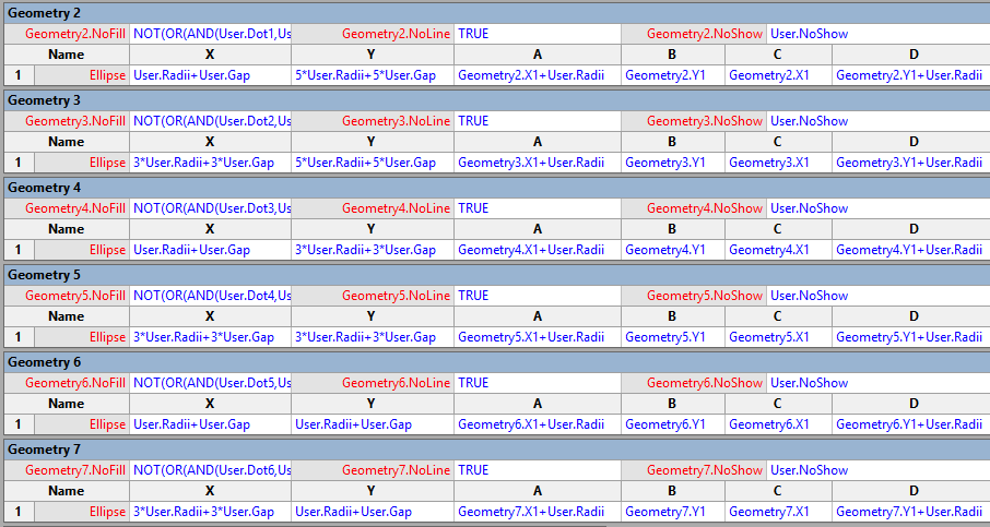 Before posting my Braille shape, I decided to embellish it first. The original shape was a single shape that had a Geometry section (Ellipse) for each of the dots (pips) and user cells User.Dot1-Dot6 contained the list of characters the shape represented. The Ellipses are independent of the shape and positioned by the X,Y of the Geometry section,. The NoFill cell in each ellipse Geometry controlled the visibility of each pip. Of course, this required negative logic, so I had to work out how to make the pip visible and then negate it.