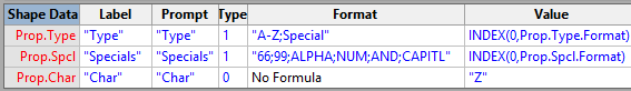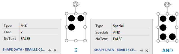 To handle the other shapes, I used a Shape Data List Prop.Spcl (“66; 99; ALPHA; NUM; AND; CAPITAL”) with six user cells User.Spcl1-User.Spcl6, some more Booleans. There is also User.SpclCode that lists the pips that need to be enabled for each special character “356; 456; 46; 2456; 12356; 6″56; 6”