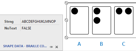 To use the shape, drag a Braille container shape to the page. On drop, seven Braille shapes will be added to the Braille container. The common type of Braille shape is A-Z and Special are unique. So, the Braille shape master should be A-Z. Once the container is dropped, the individual Braille shapes can be changed to a Special Shape. A-Z shapes inherit the character at the same position in the User Data Strng as it is in the container. If you are going to use a Special Shape remember to add a position saver character (other than a space) to the string.