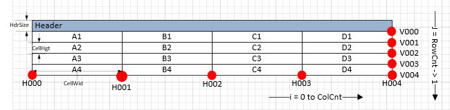 To be able to reference the individual cells, I used Excel like notation. I also added control handles (the red dots) to be able to resize the cells. With this basic shape I was able to embellish it to look like any of the Sections.